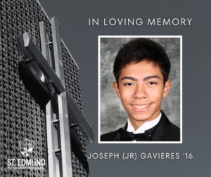 The St. Edmund Preparatory High School community mourns the heartbreaking loss of Joseph “JR” Gavieres, a beloved alumnus of the Class of 2016, who passed away suddenly on December 17, 2025, at the age of 27. His untimely departure has left a profound void in the hearts of his family, friends, and all those who knew him. We join in lifting up the Gavieres family in prayer and ask that his memory be honored through the love and care he inspired in others.